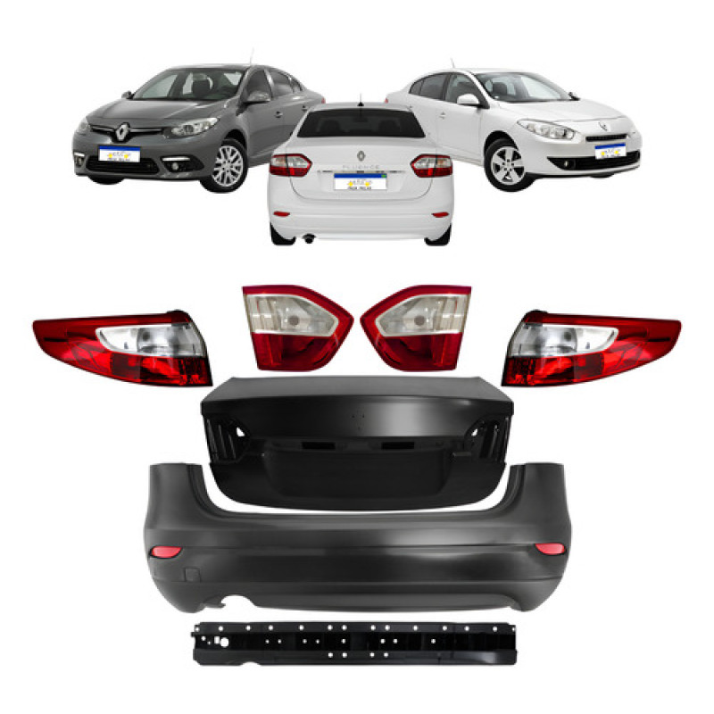 KIT PARACHOQUE COMPLETO TRASEIRO RENAULT FLUENCE COM TODOS OS GUIAS, ALMA, REFLETOR, TAMPA TRASEIRA PAR DE LANTERNA ESQUERDA E DIREITA.